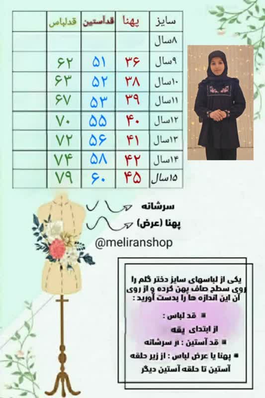 قد لباس: از ابتدای یقه تا پایین لباس اندازهگیری میشود.