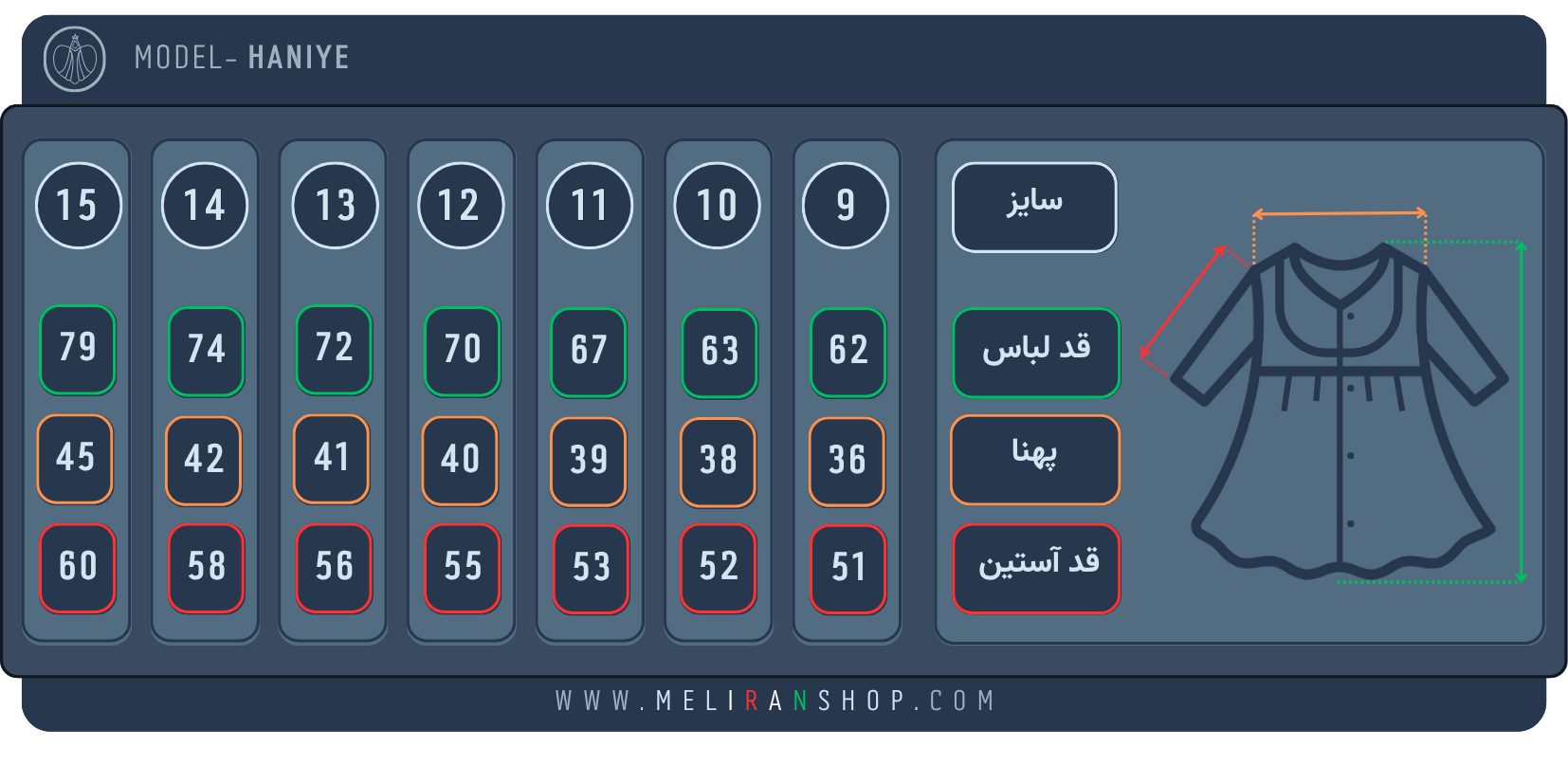 پهنا (عرض): فاصلهی بین زیر حلقهی یک آستین تا حلقهی آستین دیگر (زیر بغل به زیر بغل).