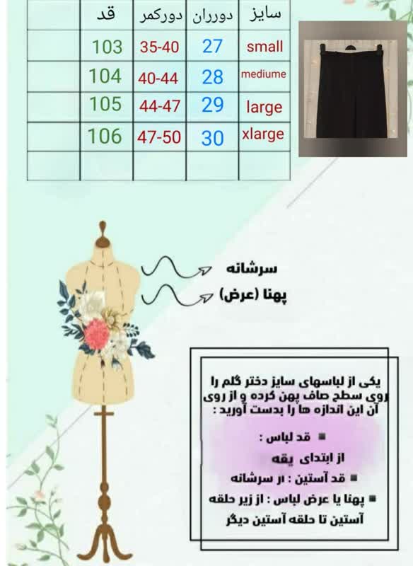 قد لباس: از ابتدای یقه تا پایین لباس اندازهگیری میشود.