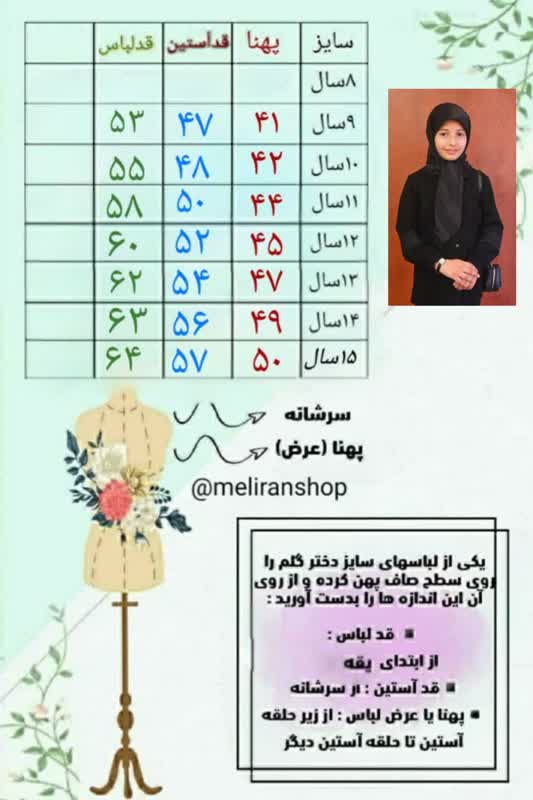 قد لباس: از ابتدای یقه تا پایین لباس اندازهگیری میشود.