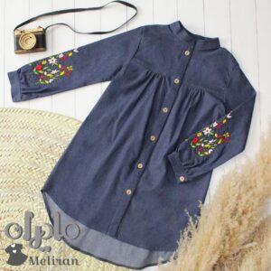 مانتو طرح لی مدل رضوان، تهیه شده از پارچه لی تنسل کاغذی و سرآستین گلدوزی شده. مناسب سنین 8 سال تا 14 سال